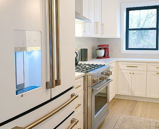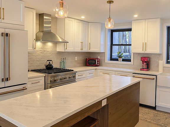 The bright, thoughtfully designed kitchen includes a 36-inch Café professional gas range, dual-door refrigerator, farmhouse sink, and two pantries, balancing style and practicality. A rear extension adds a dedicated mudroom with washer and dryer, while a full-length cellar provides valuable bonus space for storage, a gym, or studio.
