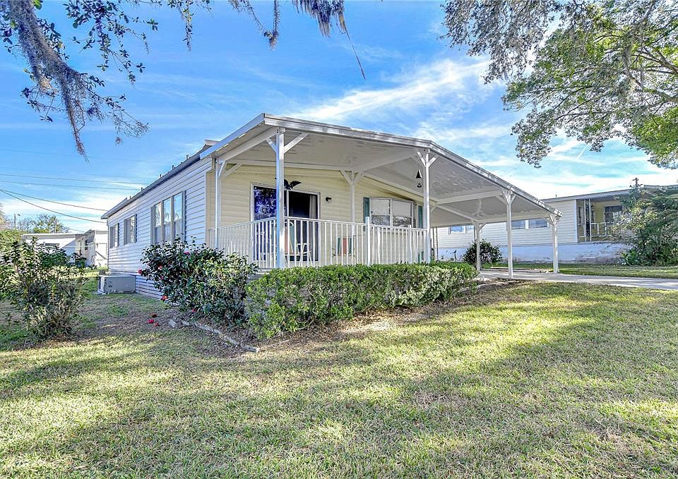 Bring your clothing and personal items! Furnished 1978 double wide with inviting covered front porch. Carport and shed with washing machine and shelving for storage on the side of the home. To the rear of it is an enclosed lanai or Florida room. From the front porch enter into sliders to the living room. This then opens into the dining room with a built-in China cabinet overlooking the kitchen with a bay window at the sink that has a special view of the front yard. The hall leads down the guest bedroom and hall bath. The primary bedroom is at the back with two built in closets. The ensuite has a walk-in shower. This park is near shopping, medical facilities and restaurants. The HOA fee includes water. Call now for an appointment to view this beautiful home.