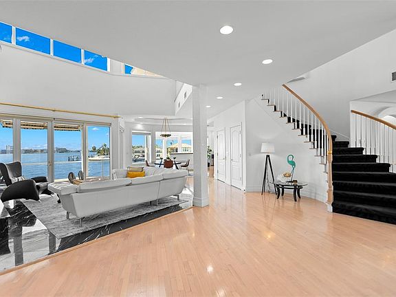 Welcome to a masterpiece of luxury and design in the prestigious Pasadena Yacht and Country Club, where this spectacular Kipps Colony Estates residence offers an unparalleled waterfront lifestyle. With over 140 feet of prime open waterfront, this home provides breathtaking vistas of Boca Ciega Bay, promising unforgettable Florida sunsets and a front-row seat to vibrant marine life. Spanning an impressive 5,254 square feet, and over 9,600 square feet under roof, this residence is a testament to spacious elegance. A sprawling RV garage, oversized three-car garage, workshop, and expansive storage cater to all your lifestyle needs. Enter through the double leaded glass doors into a world of grandeur, where the living area impresses with soaring ceilings, marble flooring, a cozy gas fireplace, and walls of sliding doors that blur the line between indoor and outdoor living. Designed for entertaining, the expansive rooms and seamless flow make hosting large gatherings a joy. The chef’s kitchen is a culinary haven, featuring solid wood custom cabinetry, granite countertops, a cooking island, walk-in pantry, and a breakfast bar with views of the family room and waterfront beyond. This fabulous layout includes an elevator servicing all levels and four spacious bedrooms, including two primary suites perfect for multigenerational living. The top floor is dedicated to an enormous primary suite, a private sanctuary with a waterfront sitting area, outdoor deck, luxurious ensuite bath, and double walk-in closets with a custom system. A separate guest suite on the opposite wing offers privacy and comfort. The home’s outdoor spaces are an entertainer’s dream, highlighted by a concrete bar overlooking a stunning pool with a pebble tech interior and multiple fountains. For boating enthusiasts, the location is ideal, featuring a wet slip for a 60-foot yacht, a 10,000-pound boat lift, and a brand new 42.6-foot composite dock. Embrace the ultimate in waterfront living, where luxury knows no bounds, and every detail is crafted for an extraordinary lifestyle in the coveted Pasadena Yacht and Country Club.