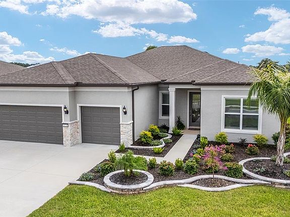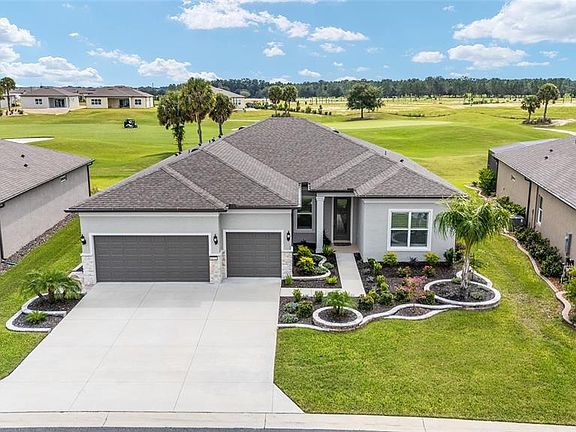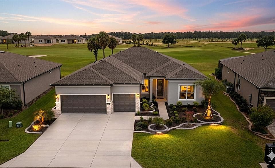 Welcome to this stunning STELLAR MODEL residence perfectly positioned on the 16TH HOLE of the Terry-Doss designed GOLF COURSE in Stone Creek, one of Ocala's most desirable 55+ gated golf community. This impeccable 2023 ECHELON SERIES blends elegance, comfort and functionality. This magnificent 3 Bedrooms, 3 Baths, plus+ Flex/Den/Office, features an exterior that effortlessly blends classic architectural charm with bold, contemporary design. Beautifully landscaped grounds with accent LED LIGHTING set the stage for this home's striking curb appeal. Stone exterior details and an elegant GLASS-INSET FRONT ENTRY creates an inviting focal point. Discover a spacious OPEN-CONCEPT design with SOARING 10'8 ft CEILINGS accented by CUSTOM CROWN MOLDINGS, PLANTATION SHUTTERS and LVP FLOORING. The Chef's kitchen showcases 42" Soft-close Wood Cabinets with pull-out drawers, Walk-in Pantry, QUARTZ counters, GRANITE UNDERMOUNT SINK, Custom Wood Canopy Hood, premium Built-in KitchenAid appliances, UNDERMOUNT LIGHTING, and a built-in BAR with wine refrigerator and display shelving adding an elegant touch for entertaining. Primary suite impresses with TRAY CEILINGS, an expansive walk-in closet, and a SPA INSPIRED BATH featuring a Roman-style shower with RAIN SHOWERHEAD and dual vanities. Guest bedroom located in the front of residence offers a PRIVATE EN SUITE. The Flex room which can be used as an Office/Den/Bonus room comes with Double French Doors for privacy. Large laundry room features front-loading Washer/Dryer, storage cabinets and counter space. CUSTOM MOTORIZED SHADES providing a seamless indoor-outdoor living space overlooking the screened LANAI showcasing PANORAMIC GOLF COURSE VIEWS and a 25x16 BRICK PAVER PATIO. PRE-WIRED SMART HOME convenience. This home comes pre-wired as a smart home, making it easy to connect security systems, smart thermostats, lighting, and other modern features for added comfort and peace of mind. Another added feature is a whole-house WATER SOFTNER SYSTEM, ensuring fresh, purified water throughtout. Completing this exceptional property is a 3-Car Garage with a 4' Extension and EPOXY-COATING FLOORING. Prime location within the community just minutes from gatehouse, golf course, clubhouse restaurant, resort-style pools, and state of the art fitness center all within close reach. Whether by golf cart, bike, or a leisurely stroll, everything you need for an active and social lifestyle is right at your doorstep. Don't miss this opportunity to own this spectacular property. Schedule your private tour today. Check out the VIRTUAL TOUR video on the link above.
