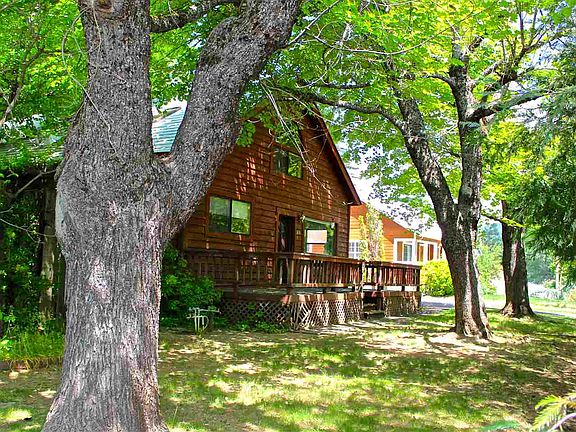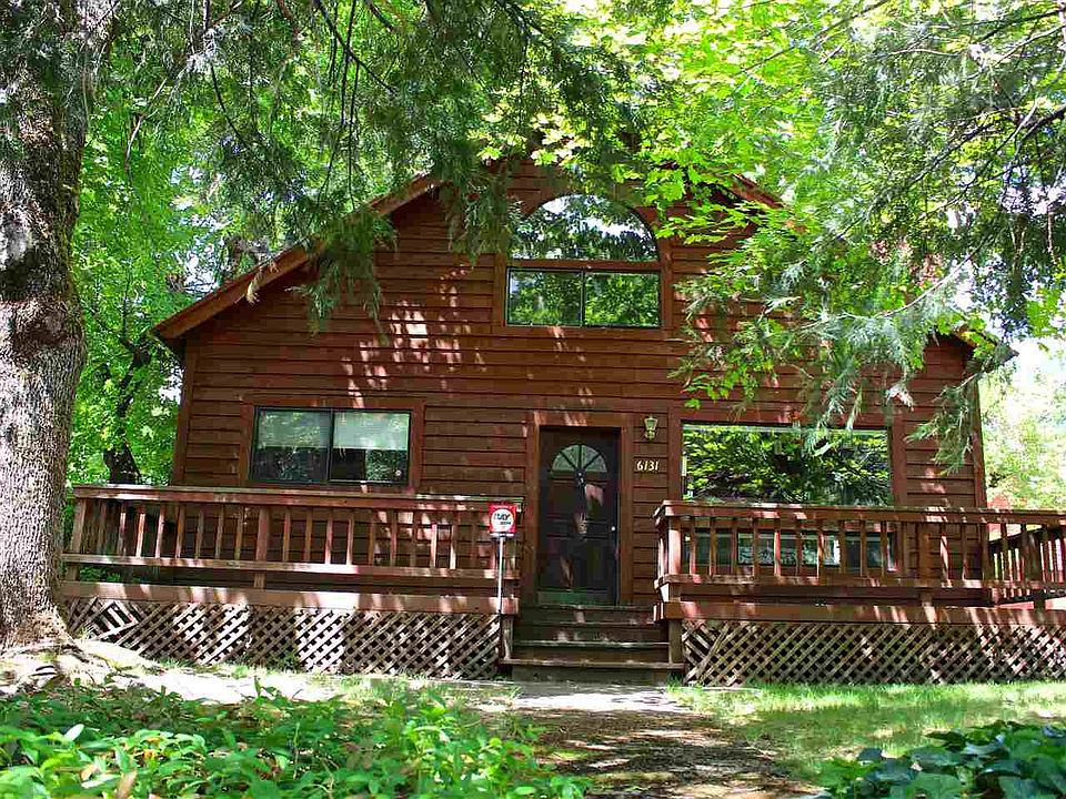 Sweet sounds of the river, sheltered by mature trees, from your amazing front deck. Knotty pine tongue and groove throughout, giving the house a woodsy feel. Fenced yard, landscaped with sprinklers, large back deck, loft area, detached two car garage. One of a kind and move in ready!