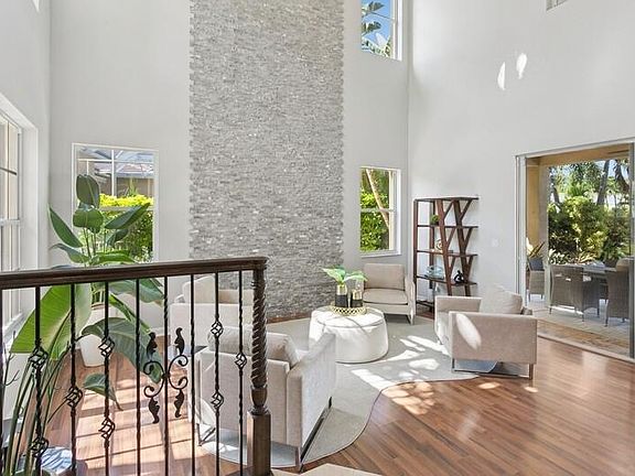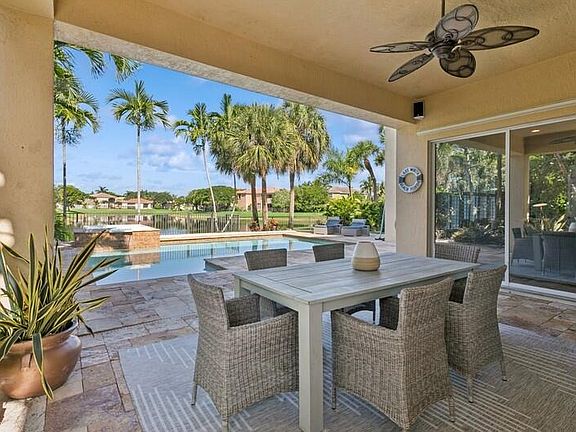 Outdoors, the backyard is an entertainer's dream. Saturnina marble decks surround the salt-chlorinated pool and jetted spa, all overlooking tranquil lake views. Both covered patio and open patio, it is your personal oasis for relaxing, BBQ's or hosting guests. Expect spectacular Sunsets! Additional highlights include Manicured landscaping, Plantation Shutters, partial Impact Windows & Panel Shutters. Roof 2022, 2 A/C 2012, Water Heater 2015, Security Cameras, 3-car garage.