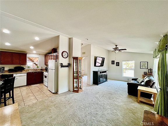 Enjoy mountain living and the 4 seasons of beautiful nature in this newer 2 bedroom, 2 bath manufactured home located on a corner lot in the community of Lake of the Woods. Built in 2013, this light and bright home offers new carpet, a spacious living room, well appointed bedrooms, dual paned windows, recessed lighting with dimmers, and indoor laundry. The kitchen has dark cabinets, plenty of counterspace and an eat-in dining area. Just off the laundry room, is access to the private fully fenced backyard where there's a 6'X8' Tuff Shed for extra storage. The engineered carport has a 60lb. rated snow load which provides for a large covered outside area. Located just 40 minutes from Santa Clarita or Bakersfield, the space rent is approximately $695 per month plus water $39 sewer $25.