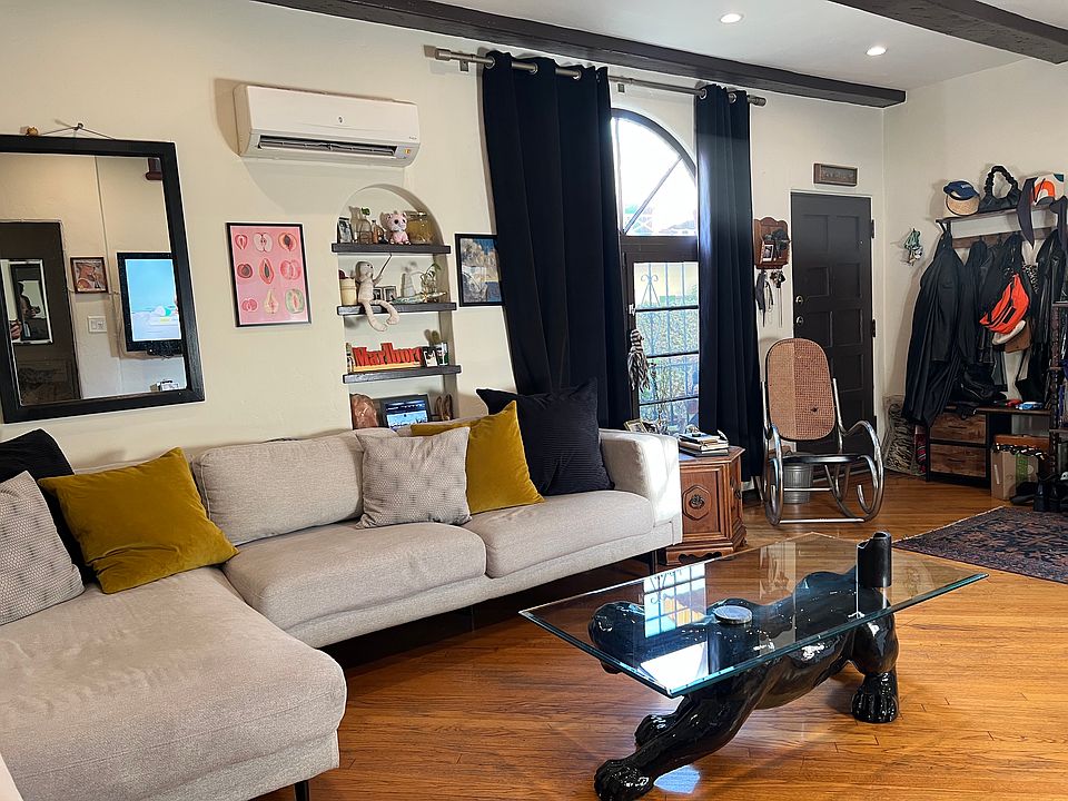 Property Highlights: -Charming 1920s Spanish style townhouse, featuring vintage fixtures and hardwood floors -Spacious two bedroom, two story layout with high ceilings; bedrooms upstairs -Each bedroom includes its own connected private bathroom rare in this price range -Perfect for vintage lovers: half furnished, with original character thoughtfully preserved, looking forward to decor collaboration -Unit includes in unit washer, dryer, and dishwasher for modern convenience Comfort & Security: -Strong air conditioning in the bedroom and three fans in the living room; equipped with a Dyson air filter for improved air quality -Secure code entry to building Parking & Guest Access: Gated on site parking available, street parking permit for guests is inexpensive (optional) Lease Terms & Requirements Month to month lease, long term is ideal Ideal credit score: 700+ Rent: $1,350/month plus approximately $200 utilities - $1350 security deposit Prime Location: Located in a great neighborhood, convenient to Trader Joes/Whole foods, 3 museums, The Grove, restaurants and shops on 3rd Street. 5 minutes to Fairfax strip and Melrose strip. -Vintage charm, half furnished minimal decor, looking forward to collaboration Month to month but looking long term. It's hard to find a good fit for a roommate, two month's notice would be very helpful. 700+ credit check ideal, background check, references check, regular apartment application, landlords are great