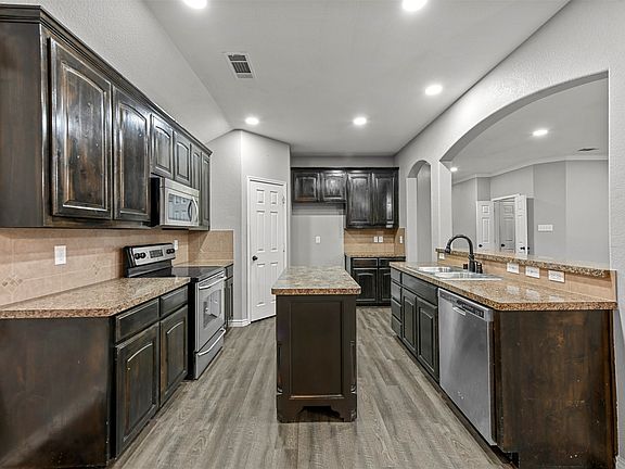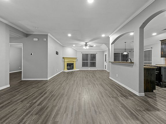 This stunning 3-bedroom, 2-bathroom home features an open floor plan perfect for entertaining or intimate family gatherings. Luxury vinyl plank flooring (2020) flows throughout the main living areas, complemented by ceiling fans and contemporary canned lighting added in 2022. The kitchen overlooks the living room’s wood-burning fireplace and includes stainless steel appliances, a breakfast bar, and an island, with natural gas available for water heating and the stove. The primary suite boasts a spacious walk-in closet, a separate shower, and a soaking tub. The split bedroom layout and ceramic tile in wet areas offer privacy and practicality. Decorative arches and crown molding add elegance throughout the home. Step outside to enjoy the large covered front porch and patio, complete with a ceiling fan and wall mount for your TV. Tenants also have access to a Nest Thermostat and Ring doorbell for added convenience. Located within a HOA community that offers full access to amenities such as a clubhouse, pool, jogging and walking paths, a boat ramp, and seasonal events. Buyers are responsible for verifying all property details.