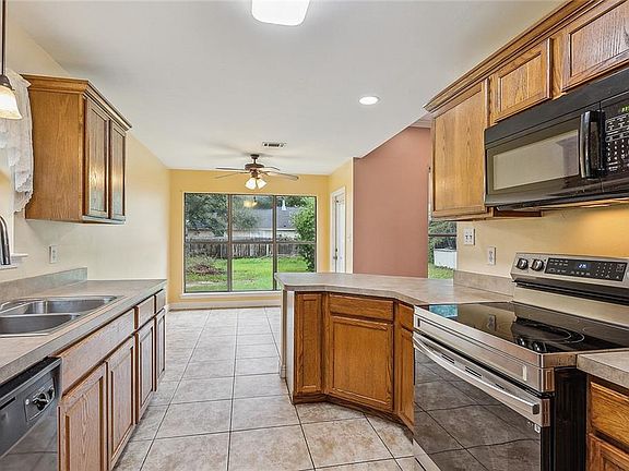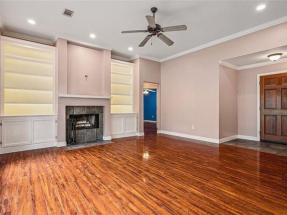 First time home buyer or investment opportunity. 3 bedroom 2 full bath home. Very clean! Large den, wood burning fireplace with matching built in lighted bookcase. No carpet in this home, Tile and plank flooring. Tray ceiling in large primary bedroom. Primary bath has soaking tub and walk in shower. Kitchen has lots of cabinets for storage. Refrigerator to remain with home. Newly installed, Laminate wood flooring, range/oven and architectural shingle roof. Flood zone "C". (flooring for closets not installed but flooring material remains for installation by new owner)