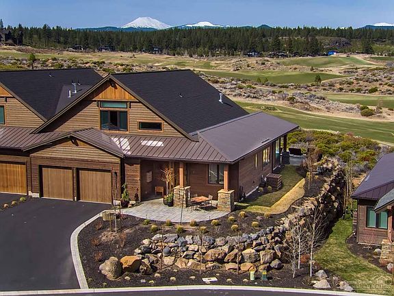This Tetherow townhome offers unobstructed Cascade Mountain views from Bachelor to Jefferson, sits on the 10th fairway & overlooks 5 additional fairways. The open floor plan includes a gas linear fireplace with a floor-to-ceiling tile surround. The gourmet kitchen features a large island, big pullout kitchen pantries & a Jennair wine cooler. This home has two master suites-one on the main level-that boast beautiful views. Contemporary styling with upgraded European light fixtures & many more upgrades.