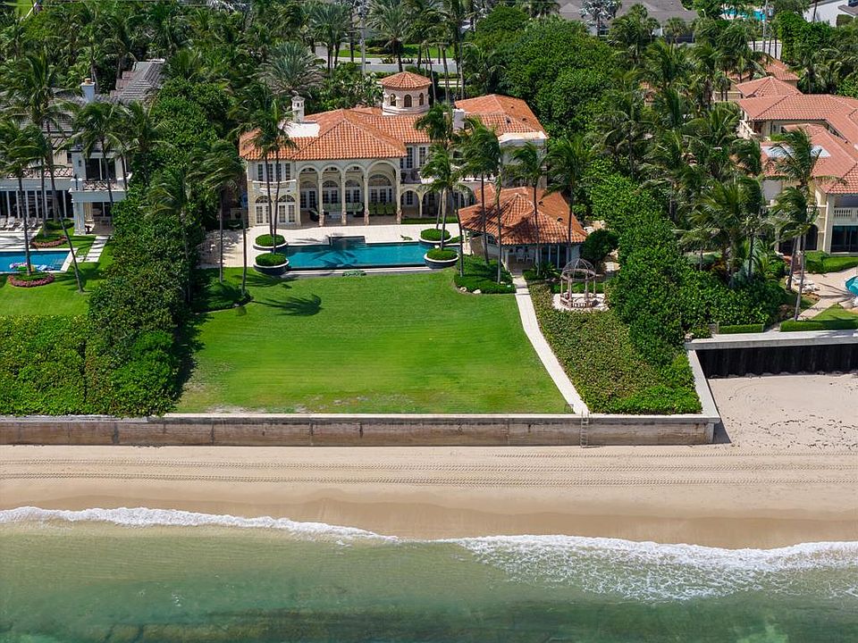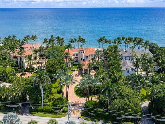 Resembling a Mediterranean villa reminiscent of the South of France, this lavishly furnished oceanfront six-bedroom, 12,968- total-square-foot estate blends elegance with ease that elevates resort-style living to a new level of luxury. Through double glass doors adorned with wrought iron, the grand entry foyer unfolds past the dramatic circular staircase set within a tower and flows through colonnaded galleries to the magnificent salon, crowned by a soaring two-story ceiling. A gas fireplace, topped by a striking overmantel trumeau, creates a welcoming ambience, while four sets of French doors to the ocean-view loggia invite the outside in. For a moment of quiet respite, step into the library, featuring custom built-in cabinetry, a coffered ceiling and French doors that also open to the ocean-view loggia and pool. From the gracious dining room, a butler's pantry accesses the cook-island kitchen, fitted with custom wood cabinetry, granite countertops, and professional-grade appliances. In an open layout, the kitchen adjoins an intimate ocean-view breakfast area and the family room with a large wet bar. Completing the first-floor layout are an ensuite guest bedroom and a laundry room. Upstairs, the primary suite, an oasis of serenity, opens to a large ocean-view balcony. Details of the suite include a coffered ceiling, gas fireplace, custom-fitted walk-in closets and a spa-inspired light-filled bathroom fitted with dual vanities, a soaking tub, a walk-in shower and two water closets. The VIP guest bedroom suite, which also opens to an ocean-view balcony, comprises banks of wall closets and a large bathroom with double sinks, a spa tub and walk-in shower. Perfect for children, one of the guest bedroom suites is fitted with built-in beds, and its ensuite bathroom is finished with whimsical wave-patterned decorator tile in the shower, while the vanity with dual sinks features luminescent undercounter lighting. On the lower level are staff quarters and access to the garages that accommodate three cars. With vast ocean views, complete architectural harmony and every amenity accounted for, this is one of Palm Beach County's most complete and compelling private lease offerings.