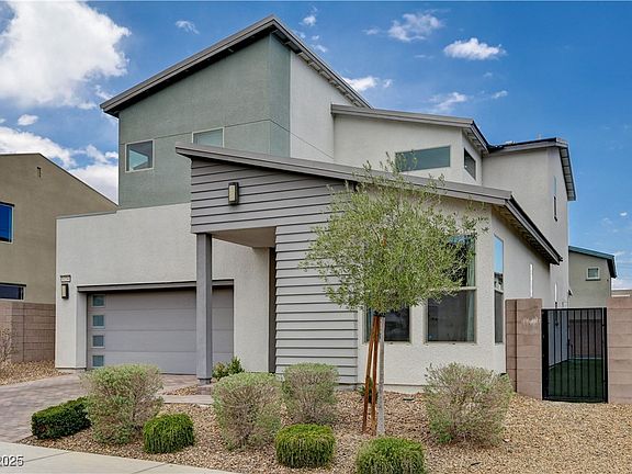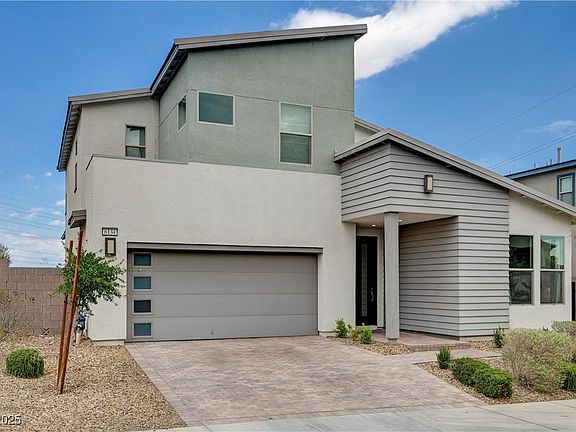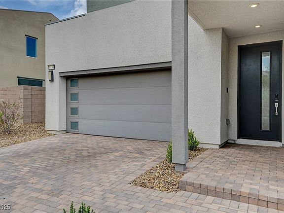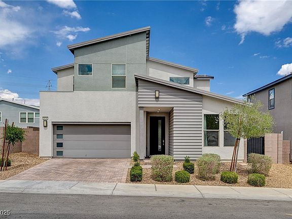 Stylishly upgraded home with modern charm on a quiet street near Southern Highlands. Entry features a custom iron staircase and abundant natural light. Open-concept layout showcases tile floors, and designer paint. Gourmet kitchen includes granite counters, sleek brown cabinets with roll-outs, a tapered island, and extra large walk in pantry. Den downstairs is perfect for office. Luxurious primary suite offers a custom walk-in closet and spa-like bath. Backyard oasis boasts a covered patio, sparkling pool, and turf.