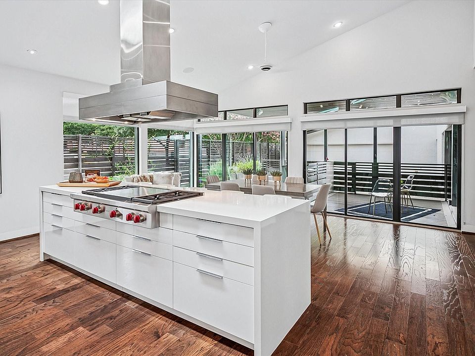 Five new VELUX skylights and floor-to-ceiling windows flood the home with natural light, while patios seamlessly connect indoor and outdoor living. The open-concept kitchen, anchored by a 48” Wolf range and oversized island, flows into the living and dining areas—perfect for hosting or relaxing.