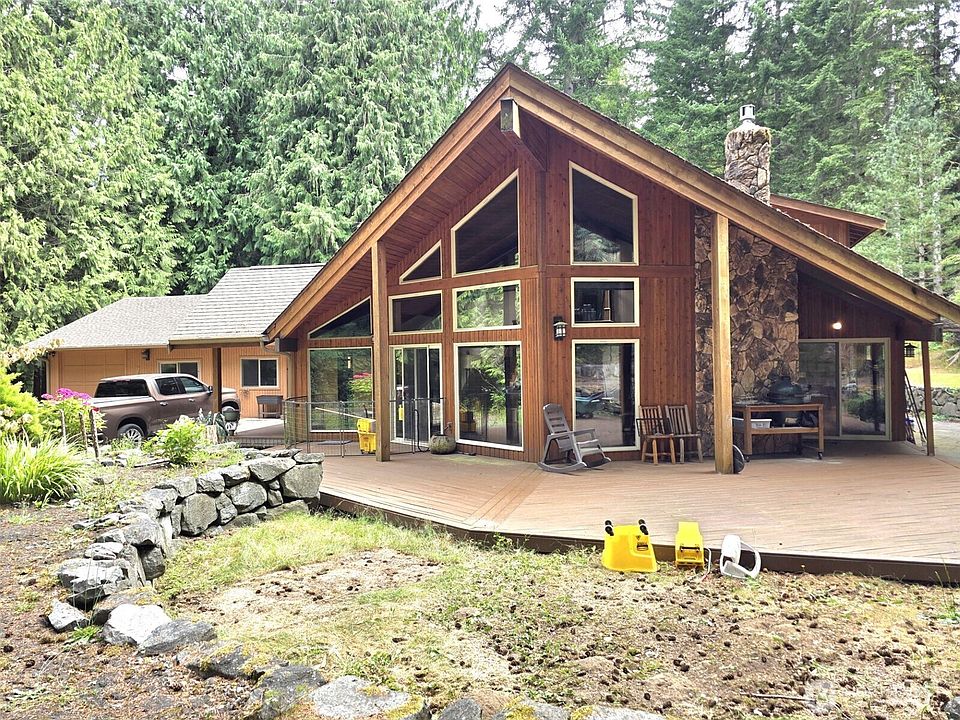 Wonderful in the woods! Warm and inviting, this home boasts an open floor plan finished with wood and stone, bringing in the richness of the natural world outside. Central living area has vaulted, tongue and groove ceilings accented with beams and a full stone fireplace at the center. Gourmet kitchen with granite, stainless appliances bathed in light from a wall of windows and skylights. Detached ADU with garage almost completed offers additional living space for guests. Gorgeous, private 5 acres with terraced landscaping, a large water feature, 2 decks, firepit, and storage shed. Beautiful Olympia location, close to Tolmie State Park and Puget Sound. A unique home in a tranquil setting- an amazing place to call home!
