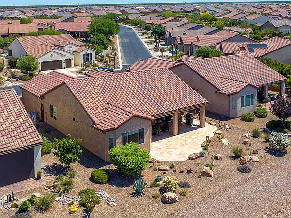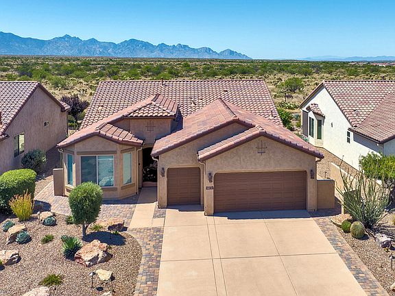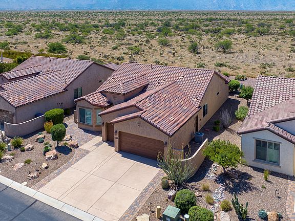 Views, Views, Views from this highly upgraded Dolce model located on the South rim of SaddleBrooke Ranch. Enjoy your unobstructed views of Mt. Lemmon and the beautiful Sonoran Desert. This home offers a chef's kitchen with kitchen island, granite countertops with full slab backsplash. The primary suite is spacious with double vanity, separate oversized shower, and walk-in closet. Split floorplan guest suite has en-suite bath for your guests' privacy. This home is expanded in all the right places. The 2 1/2 car garage is extended 4 feet, and features golf cart parking. The spacious great room opens to a large, covered patio and landscaped back yard. Why build when you can live the dream now.