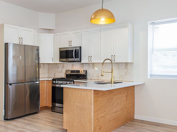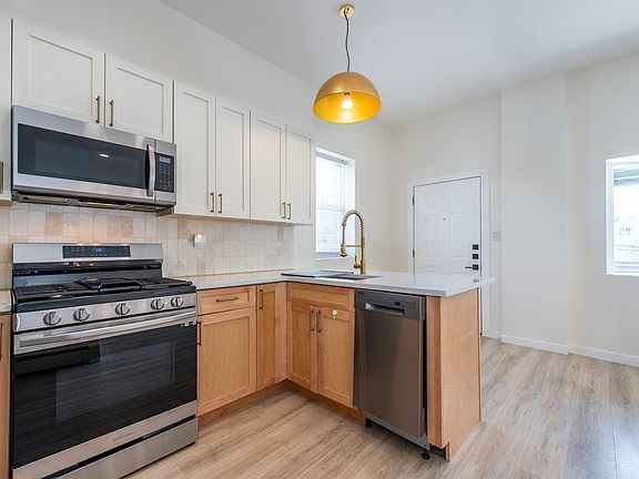 Welcome to this beautifully renovated 2-bedroom plus bonus room home in the heart of West New York! This sun-filled unit features an open-concept living and dining area with recessed lighting and stunning new flooring throughout. The modern kitchen boasts quartz countertops, custom cabinetry, a stylish backsplash, and premium stainless steel appliances, including a gas range and French-door refrigerator. The spacious primary bedroom and second bedroom offer ample closet space, while the versatile bonus room is perfect for a nursery or home office. The spa-like bathroom is complete with a designer vanity, gold fixtures, and a walk-in shower with striking geometric tile. Enjoy the convenience of an in-unit Samsung washer/dryer and efficient baseboard heating. Located in a well-maintained building with parking in front, this home is minutes from shops, restaurants, parks, and NYC transportation. Move-in ready and waiting for its new owner don't miss this opportunity for style, comfort, and convenience in a prime location! Tenant is responsible for all utilities. 2 Parking spots included.