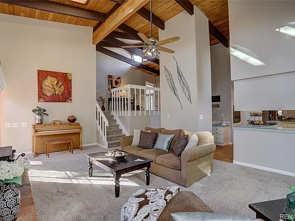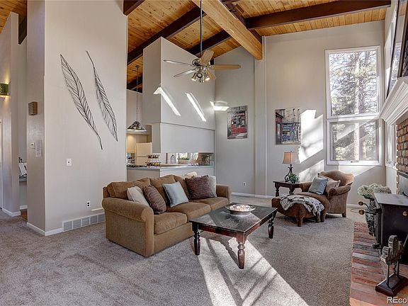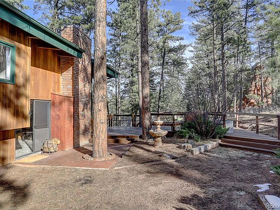 Light and bright open concept contemporary home in coveted Perry Park. Vaulted ceilings with lots of skylights and natural light. Large family room with soaring floor to ceiling windows, a wood burning fireplace and access to the large deck for you to enjoy year round. Open space is adjacent to the rear of this property making it feel even more private and expansive! 3 bedrooms up including a lovely loft. The lower level includes a bedroom, bathroom and large rec room. New interior paint, all new carpet, new sewer line and refinished deck. This is one not to be missed. The perfect home nestled among the pines on just under an acre. Easy access to I25 and Castle Rock.