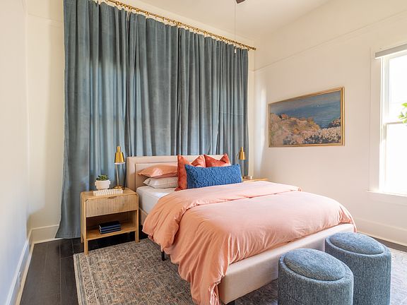 Vintage charmFull kitchenComfortable furnishingsModern flairFloor-to-ceiling velvet drapesThoughtfully curated decorBright parlor