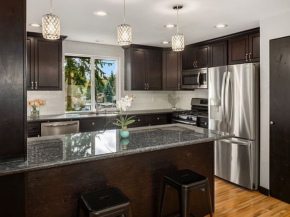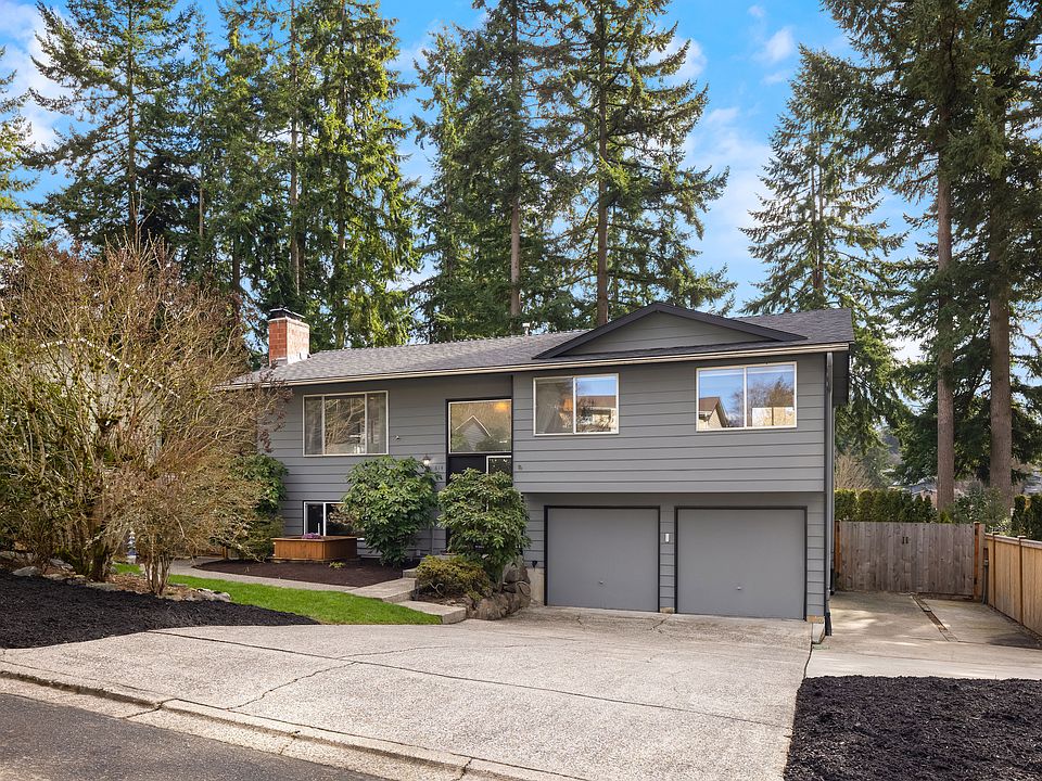 Beautifully updated home in West Bothell! Open floor plan lends itself to a great entertaining space with laminate flooring throughout. Easy flow from living to dining to modern kitchen with quartz counters, big island, tile backsplash, SS appl and deck overlooking the backyard. 3 beds and 1.75 baths on the main floor. Primary bedroom boasts an updated en-suite bath. Downstairs is a spacious rec room, fireplace, built-in bar, laundry room, bath & access to the 2 car garage. Fully fenced large backyard features fire pit seating and two large sheds with power. Sheds are the perfect opportunity for an at home office, workout room or just fantastic storage! All of this just a handful of minutes from excellent parks, shops & restaurants!