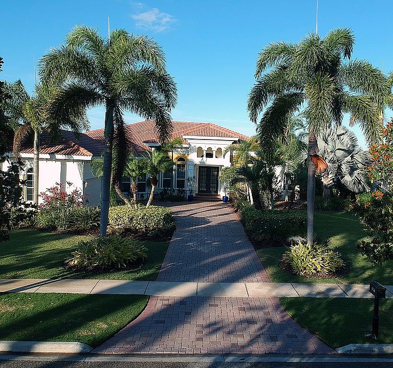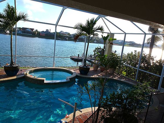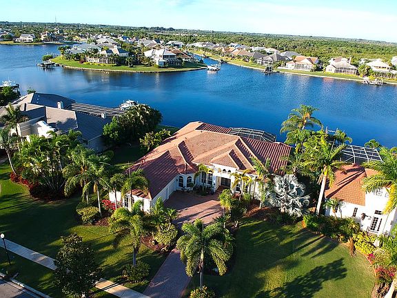 Luxury and lifestyle elegantly depicted in this John Cannon Estate Home designed for coastal living. Beautiful sunsets, sparkling water & blue sky easily slip into the grand living area through an entire wall of paneled glass pocket sliders and bay windows. Wood floors, trey ceilings, crown molding through-out, built in wall unit are just some of the many custom features. Adjacent kitchen open to the living area perfect for entertaining with top-of-the line stainless appliances, center island, L shaped granite counter, walk in pantry & private eating nook overlooking pool; enhance the openness of this home. Dining area & private office accent the large open foyer leading into the living area. Additional bonus room featuring pocket slider to 14x13 private patio with an built in grill & eating area overlooking the water perfect for a serene family room, library, or theater room. Spacious master suite with his and her walk in closets, dedicated sitting area overlooking pool & lagoon. French doors to the screened lanai & pool easy access for a midnight swim. Large master bath with his/her vanity, separate shower & garden tub complete the master suite living area. Plenty of rooms for the family or guest with 3 additional sunny, large bedrooms all with walk in closets & private baths. Large utility room with washer/dryer & built in utility sink, 3 car attached garage, pavered driveway & landscaping. Enjoy entertaining with a spacious pool area, spa, outdoor grill & dock.