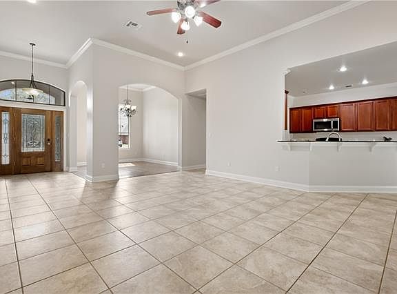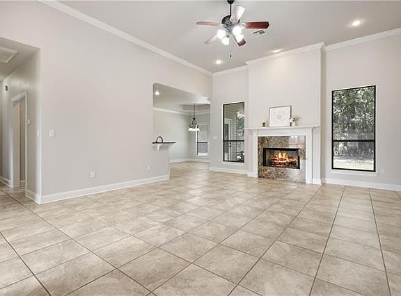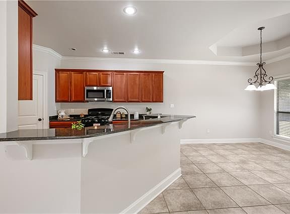 Move in ready home located in the center of town with EZ access to interstates. Gorgeous leaded glass front door invites you into this well maintained home with flowing open floor plan to all living areas. You'll love the freshly painted neutral color throughout. Den has high ceilings & lots of crown molding, radiant gas fireplace & recessed lights; great for entertaining. Kitchen features granite counters, roomy pantry, gas range & long breakfast bar for easy meal prep. Sunny breakfast area with step ceiling & formal dining with gorgeous arched accents! Primary bedroom has step ceiling; bath has spa tub, separate shower & double vanity sinks. BONUS ROOM upstairs that would be great for 5th bedroom, media room, game room or home office. Indoor laundry with 220 line or gas hookup and laundry tub. HUGE privacy fenced backyard with plenty of room for backyard play.