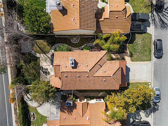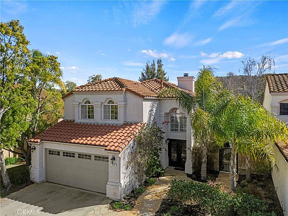 Fabulous 2-story in Wood Ranch! Beautifully designed iron and glass double doors lead to high vaulted ceilings and large windows, letting in plenty of natural light. Rich espresso wood flooring throughout, with plantation shutters. Living room is spacious, with formal dining area. Enjoy the two-sided fireplace from both living and family rooms, creating an open floor plan. Kitchen boasts quartz countertops, stainless appliances, custom cabinets and additional dining area. Upstairs to 3 bedrooms, including primary suite. Hall bathroom is updated with shower stall, vanity and glass-tiled backsplash. Primary suite included sliding door access to balcony, where you can soak in the fresh air. En suite bath with dual sinks, shower stall, separate tub and walk-in closet. Yard is pristine and well-manicured. Grassy area, two patio areas and plenty of privacy. Direct access to 2-car garage, with laundry area. Community offers pool, spa and easily accessible to parks, schools and hiking trails. Just last year upgrades such as a full underlayment replacement of the roof, and interior paint has been done to the home. A great find!