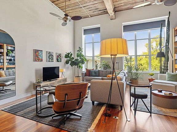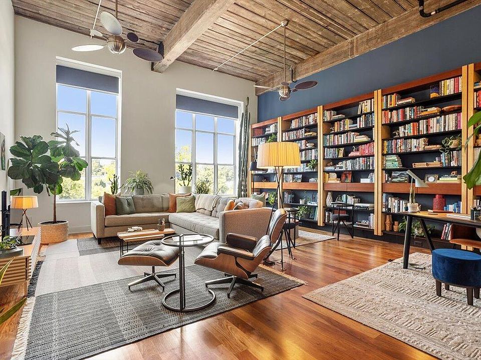 This truly one-of-a-kind historic modern condo stands apart as a rare find in Raleigh! Beautifully reimagined by renowned architect Charles Fulbright Holden. Blending 1890s charm with sophisticated modern design, it features exposed original wood ceiling beams, hardwood floors throughout, and a custom modern entry door unique to this unit. The open living area is anchored by soaring 18-foot ceilings, a dramatic wall of windows overlooking the future Smoky Hollow Park, and architect-designed built-in bookshelves. The kitchen is a stunning blend of old and new, incorporating the historic 1890s freight elevator with exposed brick and archways, high-end appliances, a dedicated filtered water tap, and LED-lit shelving controllable by smartphone. The bedroom includes custom closet systems, modern carpeting, and elegant transom window, while the spa-inspired bathroom offers a luxurious walk-in shower, heated towel warmers, and premium European fixtures—all seamlessly integrated with Apple Home automation. The unit is equipped with a brand-new HVAC system, a tankless water heater, and comprehensive smart home features for lighting and climate control. A dedicated laundry area includes custom built-in storage. With low COA fees (covering water and garbage), 80% owner occupancy, and a vibrant community featuring an active book club, this building offers both lifestyle and value. Residents enjoy amenities such as a large fenced dog park, two outdoor grilling areas, deeded covered parking, and secure storage. The location is walkable to Seaboard Station, Oakwood, Smoky Hollow, and Glenwood South, placing dining, shopping, and entertainment just steps away. Eligible for historic tax credits covering up to 50% of property taxes, this condo is ideal as a sophisticated primary residence or a high-potential rental property.