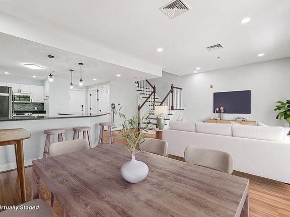 Rarely available 2-level condo at Reservoir Crossing with 1,449 sq ft, 2 bedrooms, and 2.5 baths. Bright and spacious with high ceilings, open layout, and in-unit laundry. Each level has a private balcony overlooking a wooded view. First floor features living, dining, and kitchen with new stainless steel appliances. Upstairs includes a primary suite with recently updated en-suite bath, second bedroom, full bath, and laundry. each bedroom features new luxury vinyl plank floors. Central air, ample storage, and one of the largest units in the complex. Community amenities include fitness center and in-ground pool. Convenient to South Shore Plaza, restaurants, Logan Express, public transit, and major highways.