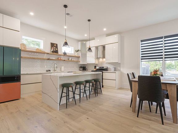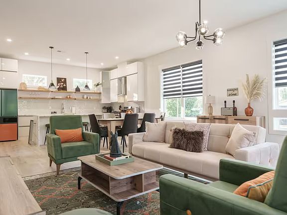 Second Floor: An open-concept modern kitchen, living, and dining area with high-end finishes, abundant natural light, and an additional half bath for convenience.