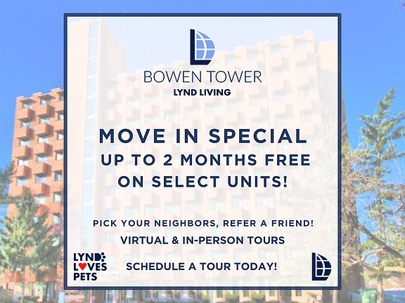 Ask about our Views Our property provides you with a wonderful community atmosphere. Completely maintenance free living for 55+ residents. Convenience, courtesy, and connection is within our ten story high rise building. We are located near pharmacies, grocery stores, restaurants, and shops! Bowen Tower Apartments is in the Kansas City area and is convenient to grocery stores, restaurants, shops, and pharmacies. Additionally, Bowen Tower Apartments is located only minutes from downtown Kansas City, the Country Club Plaza, Nelson Art Gallery, Crown Center, and many other Kansas City area attractions.