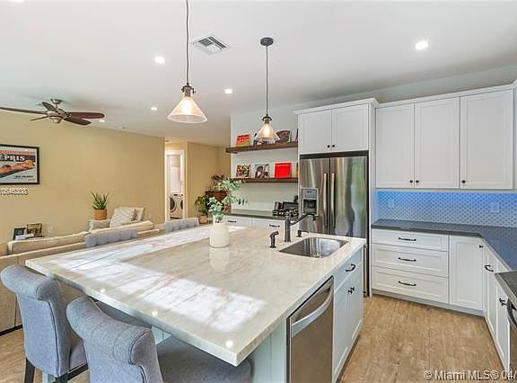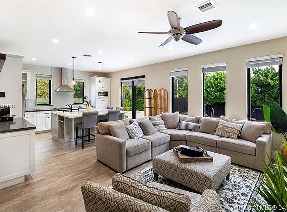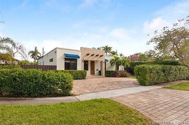 Beautifully remodeled pool home on a corner lot in David Fairchild school district! Completely rebuilt in 2015 from ground up. Modern construction. Built by a GC. 9ft ceilings, New impact windows, and French doors. Master bedroom has ample walk in closet, en-suite bath w/ Carrera Marble,Travertine tile, 5x6 beach entrance shower w/ dual shower rain heads. Smart remote control home w/ security system and cameras. 3 full beds + a 4th room / den, playroom, or home office. Engineered wood floors. Open Kitchen w/ Marble island, accent lighting, Quartzite counters, stainless steel appliances, ambient lighting. Backyard landscaped with premium astro-turf, amazing pool with sun shelf, lighted bubbler, and deck jets. New fencing throughout. Bring your pickiest buyers.