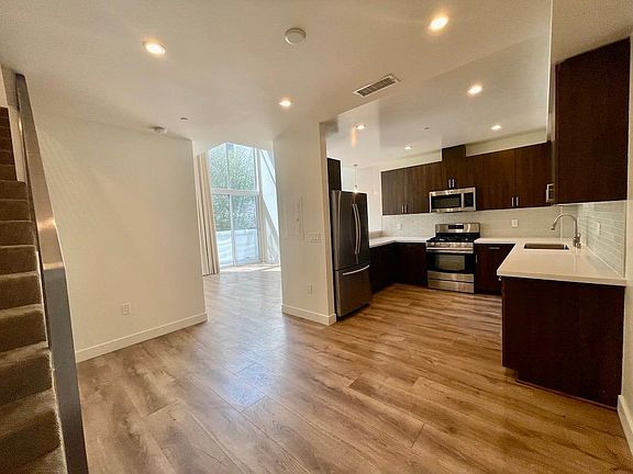 This 3 story, 3 bedroom, 3.5 bath townhome opens to a beautiful loft-style living space with 20 foot ceilings and floor to ceiling windows that cascade afternoon light into a caesarstone quartz kitchen and bar that's ready to entertain. Come home to a unique, modern and quiet townhome in this small, 5 unit complex hidden right in the heart of Hollywood. **Available for April move in, don't wait to apply and join a scheduled showing to make this your new home! These townhomes are perfectly situated to explore all of Hollywood living, easily get around the city and still enjoy a private, quiet, modern home. Enter your light filled first floor living room greeted by 20' windows in a beautiful soaring living space with a half bath near the entry for your guests. Cook and entertain at your bar style kitchen with caesarstone quartz countertops, stainless steel appliances and large countertops for the home cook. There's plenty of room for a dining table, breakfast nook and extra storage under the stairs. Head upstairs to the bedroom quarters you'll find each of the 3 bedrooms is nicely sized, and each has it's own beautiful en suite ceramic tile bathroom. En suite bathrooms make it perfect to share the home with flat mates, home office or family living, each will have their own completely private personal space. Situated in creative Hollywood near Fountain and Vine, in walking distance to gyms, grocery stores, nightlife, Thai town, production spaces, Netflix campuses and Hollywood/Vine metro station. *this unit is being repainted and prepped for new renters. Available for Mid April move in. Photos show the layout, construction and amenities of these townhomes. Actual unit layout may vary from the photos with the same or similar amenities and finishes. All units are living and kitchen space on the first floor with bedrooms on upper floors. Home detaills: 1550 square Feet 3bed 3.5 bath - First floor half bath 20' living room windows with custom drapes. Central AC and Heat Security Alarm and intercom In Unit Stacking Washer and Dryer Lots of closet space Gated parking (2 spots, tandem) and bike racks Pet ok with deposit 1 tandem parking space for 2 full sized vehicles in the garage. Lease Info: Renter responsible for all utilities (gas, power, water, internet, etc.) Owner pays trash service, only. 1 year lease - no short term leases Quiet building with community guidelines. Owner managed Zero AirBnB or Vacation Rental allowed. Non smoking units. Small dog/cat allowed with deposit. Ask for application link and scheduled showings. Renter responsible for all utilities (gas, power, water, internet, etc.) Owner pays trash service, only. 1 year lease - no short term leases Quiet building with community guidelines. Owner managed Absolutely No AirBnB or Vacation Rental allowed. Non smoking units. Small dog/cat allowed with deposit.