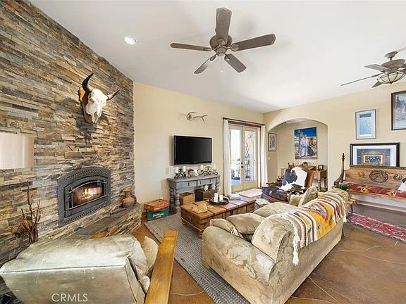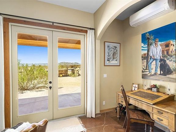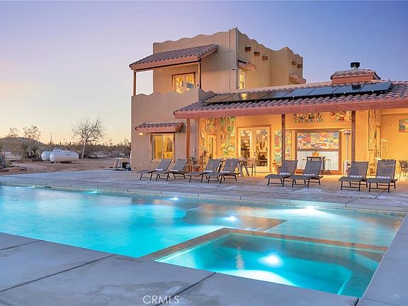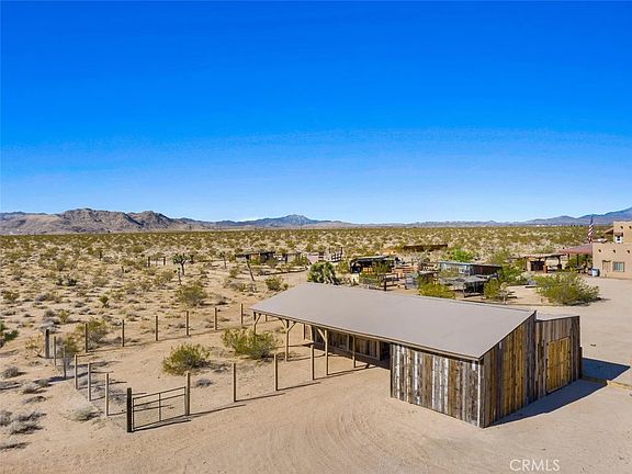 Tranquility & privacy awaits! This newly upgraded three bedroom, three bath home is located on 15 acres right in the heart of Joshua Tree. Throughout the home you’ll enjoy the simple yet thoughtful touches that slowly transform your busy thoughts into a relaxed, meditative state. Conveniently located 20 minutes from Joshua Tree National Park, 13 miles from black rock nature center & 8 miles from local grocery stores. Unobstructed poolside views of Joshua Tree National Park perched on the southern horizon. Newly constructed Pebble Tec pool blends seamlessly with the landscape. This 15-acre ranch, located 20 minutes from Joshua Tree National Park and 13 miles from Black Rock Nature Center, perfectly merges luxury with the raw essence of the desert. Relax in the 50-foot pool or enjoy a tranquil evening in the 10-person spa. Pride of place is the outdoor patio, adorned with awe-inspiring artwork crafted by Master Artist Troy Bryant and 100 other local talents, ingeniously piecing together portraits of the very animals who once roamed this ranch. This outdoor space also features a barbecue area complete with ample seating, ideal for those who love to host. Nestled in its harmonious environment, you won't find a neighbor for at least 3/4 of a mile in any direction. Bask in the serene privacy of this secluded gem where you can lay under the stars unclothed if you so choose, with not a soul in sight. This desert gem sleeps 13, offers a 3 bedroom, 3 bath cheerful, sun-bathed living space fully furnished with a 3-car garage and includes multiple outdoor sheds and 2 Conex boxes for all of your storage needs. 20kWh of solar and 2 Tesla batteries provide peace of mind by eliminating the electric bill and giving seamless protection in the event of any power outages. There are 2 industrial swamp coolers designed to cool the house and mini splits in each room to bring each area to your desired comfort level. The roof deck allows for nearly 360° views of Joshua Tree taking sunrises and sunsets to a whole new level. The 5-acre lot that adjoins the house lot has a little dirt racetrack for UTVs, dirt bikes, or ATVs, and even a 5-acre lot to the south with a paid water meter on it. The grounds are intricately lined with railroad ties from the very tracks that helped pave the West. The existing infrastructure, including water spigots at each animal pen and intact fencing, allows the new owner to easily revive the bustling ranching operation if desired.