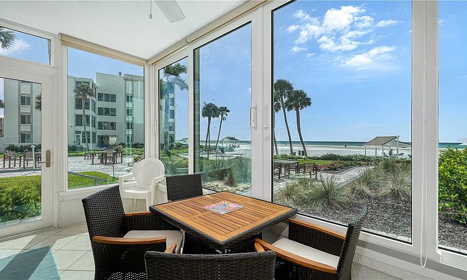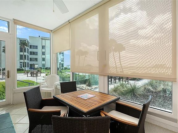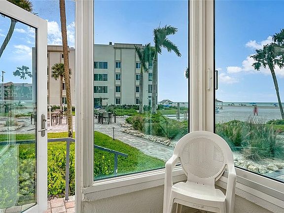 It's all about THE VIEW and the Direct Beach Access!!! This first floor condominium has a Full Gulf View from the living room and glassed-in lanai. The water views are amazing, and the sunsets are gorgeous! You will walk out your front door right down to the sand to enjoy the warm Gulf water in minutes. There was no water intrusion and no water damage to this unit in past storms, as there are enough steps up from the level of the beach sand to make it elevated! Or use the ramp for easy luggage access. The windows and doors are all wind and impact-rated, so you'll have peace of mind and a quieter home. All the floors are tile for easy care. The kitchen and bathrooms have been updated, including solid surface/granite counters and the elegant tiled showers. Furnishings and appliances have been updated in the past year. This unit is move-in ready, or you can continue to rent it with a 3-night minimum for instant income (over $58,000 income after paying rental mgmt expenses in the first 9 months of 2025). On-site management is available for all your needs. The landscaping has been refreshed, there are new tables and chairs for outdoor dining or games, and beach chairs and chase lounges are provided, as well as shade under the condo's cabanas on the beach. Shuffleboard and corn-hole games await in the center greenway. The community pool is heated for your year-round enjoyment. On the occasional rainy day, you'll enjoy the games in the club room (billiards, foosball, board games and puzzles). If you want to explore the Siesta Key Village shops, restaurants or nightlife, or explore Turtle Beach, just hop on the free trolley or other free ride-share vans. A 20-minute drive will take you to downtown Sarasota, including shops, restaurants, access to off-shore fishing or tour boats, opera, symphony, art museum, ballet, and live theater. With easy access to I-75, airport, colleges, Lifelong Learning, wine and spirits-tastings, and multiple parks and the Legacy Trail for biking, jogging, or skating, Sarasota and Siesta Key have it all! This condo is your key to the fun, so bring your toothbrush and swim suit and ENJOY IT ALL!