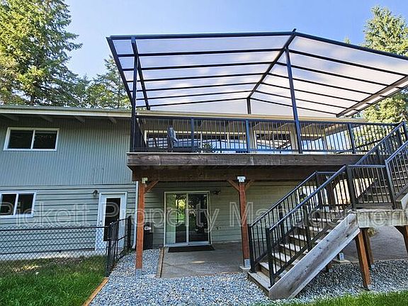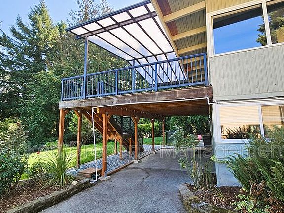 Contemporary 4 bedroom, 3.5 bathroom home with water view of the bay! This house is perfectly set up for multigenerational living with the upstairs boasting a living area with vaulted ceilings, wood burning fireplace, and a must see updated kitchen with stainless steel appliances, wine refrigerator and farm sink. Access to the large, covered deck is off of the dining room, which is perfect for entertaining, or to enjoy a beautiful sunrise or the fireworks from Whaling Days! There are 3 bedrooms and 2 bathrooms on this floor. The lower area has a mother-in-law suite with its own entrance, kitchen, and handicap accessible bath. Washer and dryer are provided for your convenience. There is a shed/shop and carport. The large, circular driveway is convenient for parking. Home is situated on a dead-end street, off of the main road. Home has oil forced air heating and is on a septic, so tenant will pay and additional $25 monthly septic fee in lieu of sewer. Close to downtown Silverdale with shopping and dining, Naval bases and hospital, and the bus line. Cats and medium-sized dogs are welcome with approved third-party pet screening, additional $500 deposit, and $35 monthly pet rent, per pet.