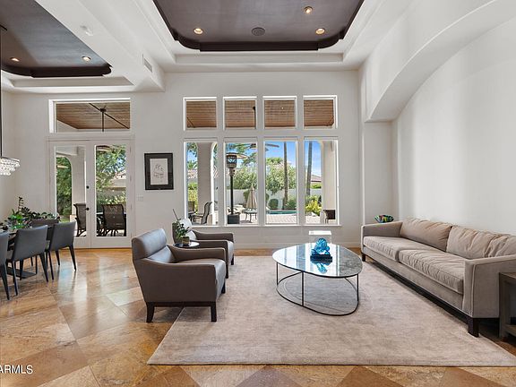 Rare opportunity to buy in Orangetree Manor! 1/2 acre corner lot with N/S exposure. Enter to soaring 22-ft ceilings + elegant travertine tile. The chef's kitchen boasts Viking gas cooktop, walk-in pantry, coffee bar, wet bar—ideal for entertaining. CONTROL4 system manages surround sound, security, and lighting. Primary includes vaulted ceilings, stone fireplace, + backyard access. The en-suite includes separate vanities, 2 walk-in closets, large tile shower, + separate soaking tub. Outdoors, relax w/ heated pebble tec pool + spa (2019), extended patio, new pavers, built in BBQ, mature landscaping/fruit trees, + basketball/sport court. New tile roof + stucco (2021) + 3-car garage w/ cabinets (2023), water filtration, soft water, + water heater recirculation pump. Minutes to PV + Kierland!