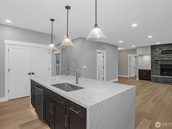 Come and see this move in ready, new construction home. Beautiful lake views create inspiring back drops to most rooms. The large modern kitchen has a built-in refrigerator and freezer. The open concept living area opens onto a covered deck. There is also a covered patio below for year-round outdoor enjoyment. The home has a large main floor primary bedroom, over-sized walk-in closet, tiled walk-in shower and soaking tub with rain shower. The lower floor is bright and spacious with 2 bedrooms, huge rec room, private home office and sauna! This custom quality home features a stylish powder bathroom, completely finished garage, abundant storage, lots of hardwood and a high efficiency heat pump with A/C. This home is a must see!
