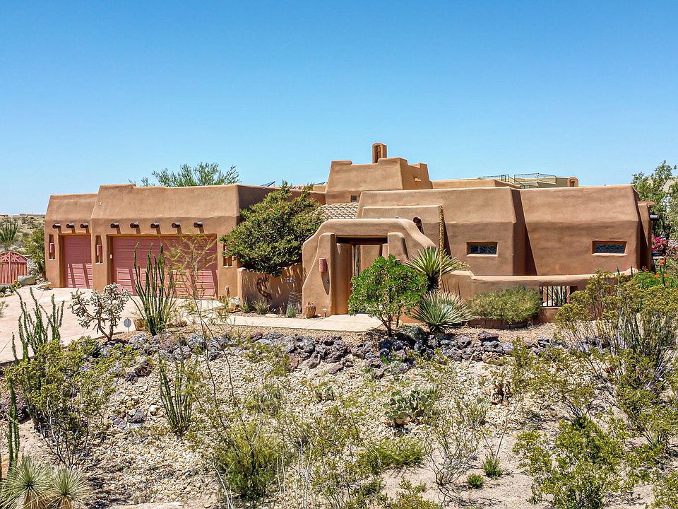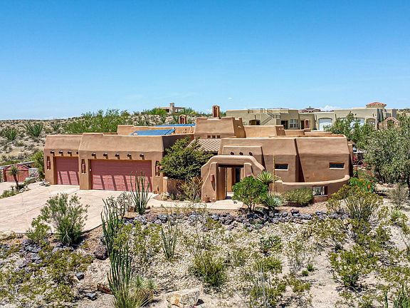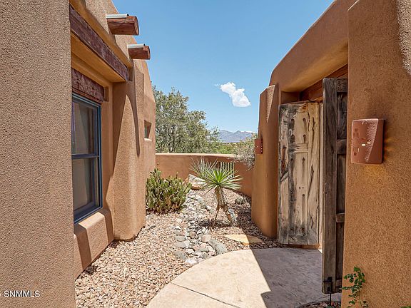 Stunning, custom Pueblo style home on an elevated lot in the gated community of La Tierra Escondida. If you are a veteran looking for a VA assumable loan with a very attactive rate this is the home for you. This retreat features numerous outdoor living spaces, an oversized 3 car garage with 220, 3 fireplaces, Saltillo tile throughout, glowing hickory flooring in the living area, a dining area, breakfast room, office and so much more! The living area, primary suite, office, 1 bedroom and the expansive east facing patio showcase stunning views of the Organ Mountains. The living area features a kiva fireplace, vigas & 12 ft ceilings. The dining area & breakfast rooms open up to a sunroom/atrium which further opens up to a secluded area with a soothing water feature. Energy saving solar, unique fixtures, built-ins and custom touches throughout make this home a rare find.