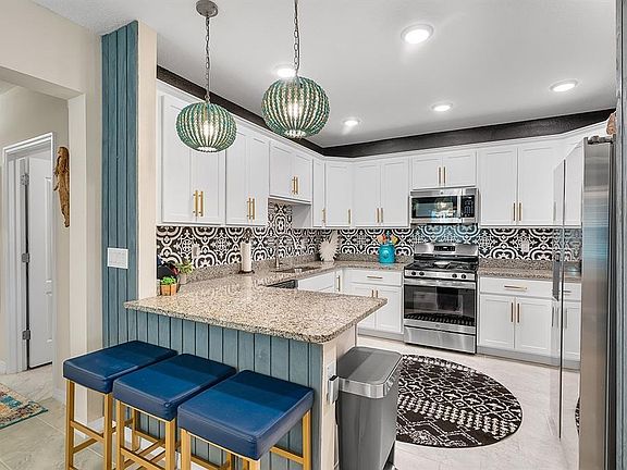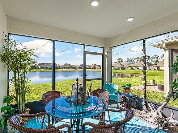 This 2020 villa is located in a gated, vibrant 55+ active community, where residents enjoy an array of activities, including pickleball, social events & more. It features two spacious bedrooms & an oversized office that can double as a guest room or hobby space with a 1 car garage. It has tile flooring thru out & the kitchen and primary bath are equipped with custom backsplashes. It's adorned with custom seaside-themed lighting & shiplap paneling. Enjoy the full lake view on your screened porch in a natural gas community with impact glass throughout, offering peace of mind & added security.