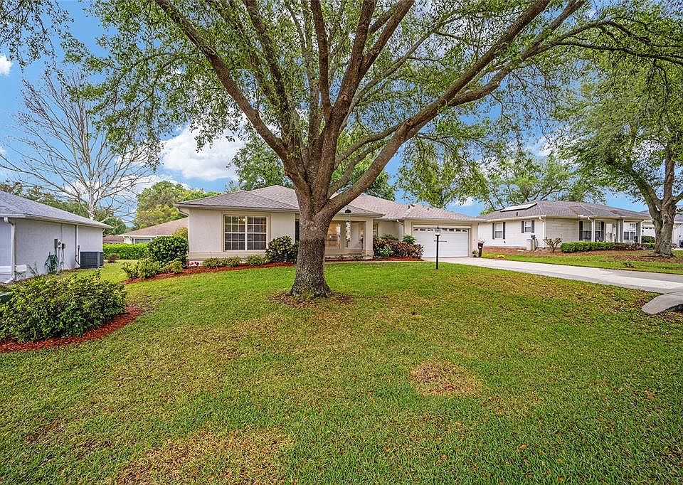 This is a block home that is nicely designed and features a large 24'x16' great room with a vaulted ceiling.The garage was built extra deep to allow for more storage and has a roll up screen door and a fold up ladder that leads to a large attic storage area. Each bedroom has a walk-in closet and the master bedroom has a trey ceiling, large walk-in closet and large walk-in shower. The home comes with a water softener, in-door laundry, ceiling fans and wood blinds throughout the house. A new roof was installed in 2021. The inside has been freshly painted and the outside was painted within the last 3 years.The outside is beautifully landscaped with large live oaks in the front and back yard and has an irrigation system. HOA includes trash pick up, public sewer and 27,000 gallons of water as well as access to the community center that has a large solar heated pool, bowling ally, fitness center and much more. This is a 55 and older community.