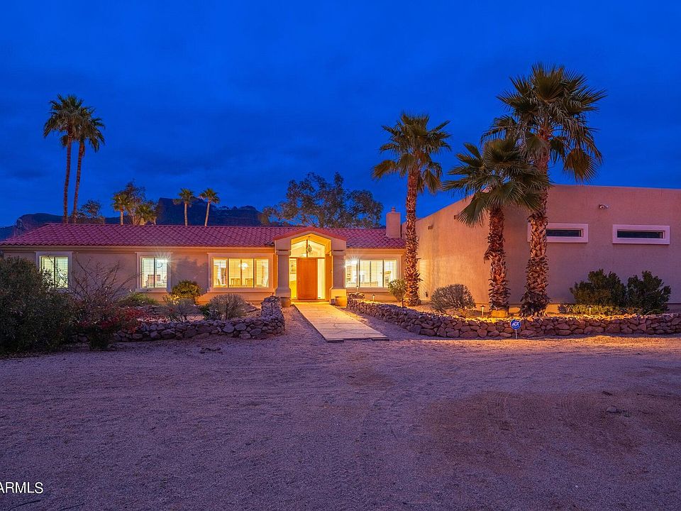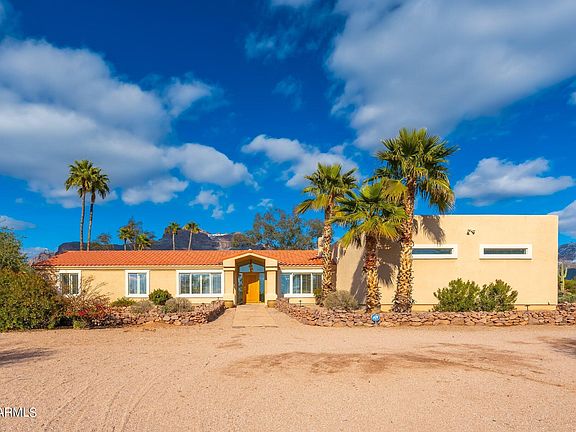 Did the Lost Dutchman bury his gold treasure on this 1.157 acres of desert? Most likely not. However, there certainly is a treasure in this beautiful home with amazing views of the Superstition Mountains. The entire home had a massive renovation in 1999 including an addition, garage, all new wiring and electrical system, stucco, roof, plumbing and much more. True pride of ownership in this custom home with two primary bedrooms, three and a half baths and den with storage. Open kitchen has amazing views with double oven, RO system and breakfast bar. Large fireplace in the family room. Den is located next to formal dining room. Huge primary suite has private exit, full bath with double sinks, soaking tub with jets, step-in shower and walk-in closet.Secondary primary bedroom also has pri vate exit to back patio. The Bonus great room is huge and ready to become your favorite room in the home. Includes surround sound and is pre-plumbed for a wet bar!