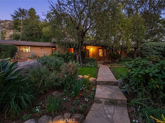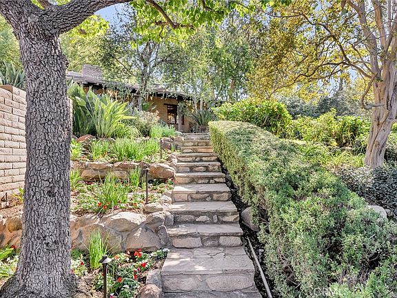 HAWARDEN HILLS- “Old” Hawarden Drive- An enduring piece of Riverside’s Citrus Heritage, the Stewart Malloch House built in 1937 of 12”-16” thick adobe block rests discretely on a bench of the hill surrounded by mature landscaping and Avocado Groves. Malloch, the grandson of William Irving and Great Nephew of Matthew Gage channeled the Architecture of early Riverside in designing this epic sprawling ranch style home. Embracing the efforts of the period’s Architect’s desire to create a regionally contemporary style, exceptional quality was built into this home with materials such as pegged oak hardwood floors, smooth plastered walls and ceilings, Steel divided light casement windows and Mahogany doors and trims molding throughout! Complete interior by renowned and published designer Carleton Varney adheres to the genuine theme of the home with a timeless refined western effect. Every space of this home is an experience, from the welcoming shelter of the massive front porch to the hospitality of the formal living and dining rooms and cozy study; to the spacious bedroom suites, all these spaces containing fireplaces for a total of 6 in the property! The grounds are a delight to the senses with the shade of mature trees over a century in age, manicured lawns, enchanting flower beds, peaceful Koi Pond with waterfall and gazebo, Built-in Bogner Spa off the primary suite and the odor of Citrus Blossoms throughout the year from the many varietals grown in the area. A massive six car garage measuring over 1,200 Square feet as well as the welcoming motor court just inside the privately gated driveway further compliment this truly special property. The property consists of 3 separate legal lots and is to be sold completely intact. The house and surrounding improvements sit on just over 3.1 acres with the adjoining 2 lots covered mostly in Avocado Varietals measure 1.08 and 2.38 acres for a total of 6.56 acres. Offered in pristine condition by the second owners for the first time in over 55 years!