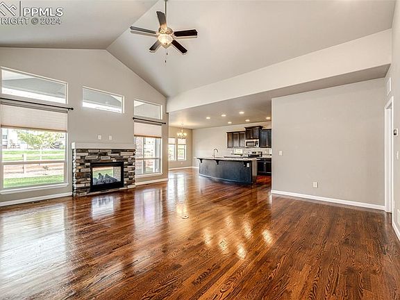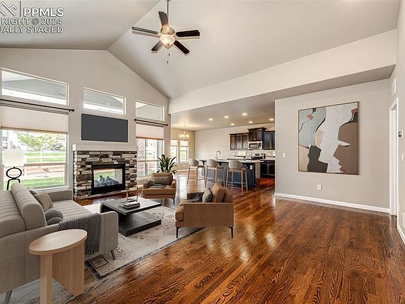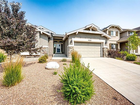 Beautiful 4-Bedroom 3 Bath ranch style home in the sought after community of Wolf Ranch with Pikes Peak views. You'll fall in love with this home. As you enter, you are welcomed with immediate views of the grand living room featuring a vaulted ceiling, large windows, and a double-sided stone gas fireplace. The Living Room opens to the Kitchen, Dining area & Patio - which is perfect for entertaining. The gorgeous eat-in kitchen boasts 42” espresso cabinetry, granite countertops, modern tile, stainless steel appliances, a large island & walk-in pantry. Gleaming hardwood floors flow nicely on this main level. The primary bedroom is spacious & offers its own luxurious 5-piece en-suite bath with soaker tub, tiled shower, double sinks, granite countertops & large walk-in closet. The 2nd main level bedroom or home office is light & bright, as well as adjacent to another full bath - making it perfect for guests. The finished basement boasts high ceilings, a large bonus area with 2 large windows inviting in lots of natural light with ample space for a second family room, play room & or gaming area. It also features 2 spacious bedrooms that share another full bath with double sinks & granite countertops. Last but not least, a nice sized storage closet because you can never have enough storage space. Enjoy plenty of Colorado evenings relaxing on the covered back patio with its indoor/outdoor fireplace. The HOA maintains the front & back yard, so you can spend your spare time enjoying the things that you love to do most! The 3-car tandem garage provides more than sufficient space for vehicles, storage or projects. You are sure to enjoy all that this community offers including parks, a swimming pool, and a clubhouse. It is a 5-minute walk to Wolf Lake where you can fish & kayak. Or attend neighborhood concerts and events throughout the year. Close to shopping, restaurants, entertainment, Military Bases with easy access to Powers Corridor & I-25.