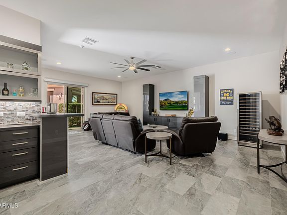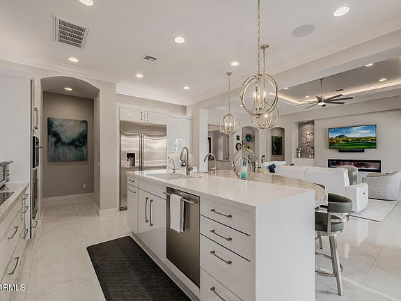 Prepare to be amazed! Check out this immaculate 4 or 5 bedrooms w/ensuite bathrooms, 5.5 bath total. Quartz countertops, modern lighting, the entire house has tile floors. Oversized epoxy coated 4-car garages. Interior boasts tray ceilings, crown molding, and a neutral palette. Kitchen island seating, breakfast nook, and a formal dining room - enough for a large party. Indoor fireplace and three outdoor fire pits. Media room could serve as a multi-gen living space with kitchenette and private entrance. Chef's kitchen is equipped w/ample cabinetry, quartz counters, a walk-in pantry, SS wolf/monogram appliances, there is also an additional storage pantry. Programmable electric shades. Heated saltwater pool and spa, outdoor ramada, gas grill. There is TOO MUCH to list. A MUST-SEE home. The grand primary suite showcases direct outdoor access, a walk-in closet, and a lavish ensuite w/dual vanities plus separate tub & shower. Separate guest quarters also boast their very own living area and kitchenette! Lastly, the resort-like backyard includes a covered patio, extended seating areas, a lovely gazebo, built-in BBQ, fire pit, a sparkling blue pool, and a refreshing spa! The home of your dreams is here, don't let it get away!