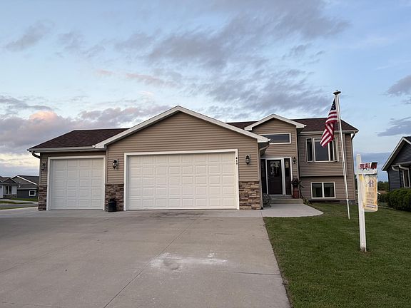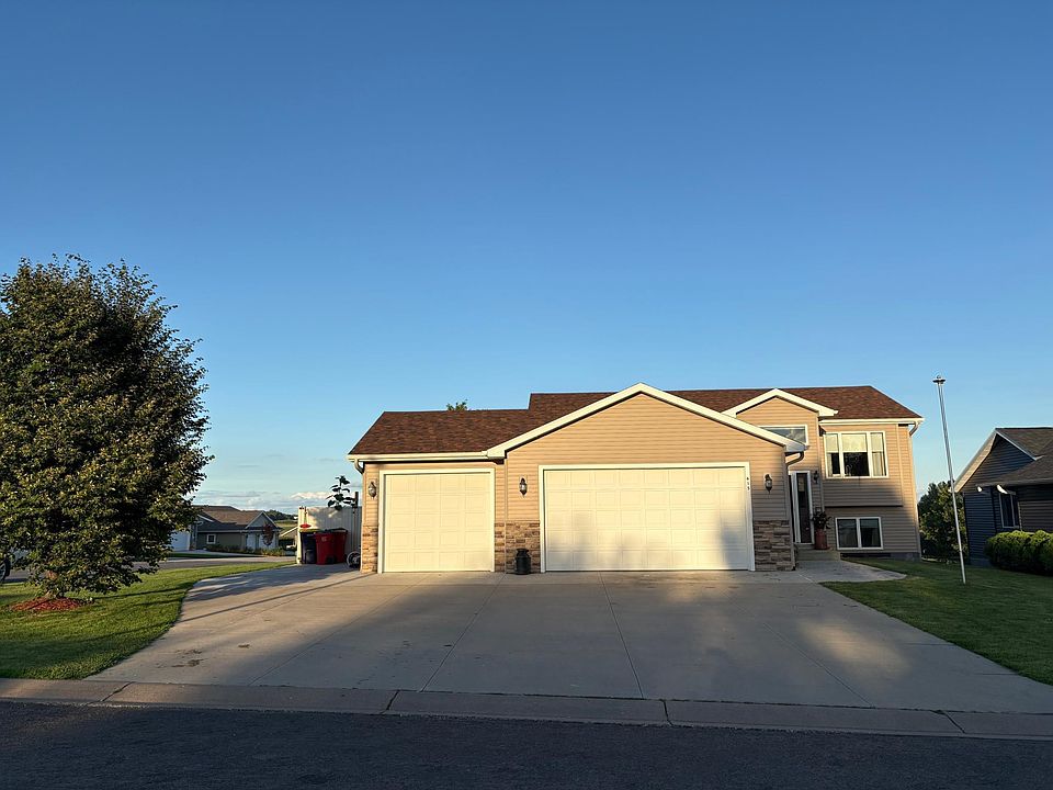 Walk-out split level home with 3 stall, attached garage. The large foyer is an inviting entry to this beautiful home! Open floor plan kitchen/dining/living areas with vaulted ceiling. Laminate flooring on main level. Primary bedroom and dining room offer separate access to the deck. Walk-out lower level features a huge family room with LVP flooring, and finished, framed in fireplace rough-in. Large full bath with jetted tub. Patio and deck to the east provides shade to the backyard on the warm evenings! Added cement around garage provides additional parking and large patio space. Nice corner lot!
