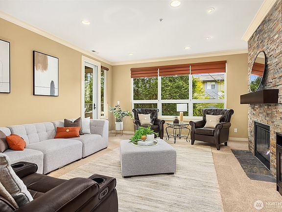 Welcome home to Park Ave building, located just a block from Kirkland Urban & DT! This south-facing, end unit enjoys abundant natural light & privacy. Fully remodeled in 2021, this 2bd/2ba condo offers a fabulous open floor plan. The open kitchen showcases striated bamboo flooring, recycled glass quartz countertops, custom cabinetry, pantry, built-in desk & lovely dining nook surrounded by windows. The oversized living room features a gas fireplace & access to the private covered deck. The spacious primary includes walk-in closet w/ built-ins, entrance to the patio, & 4-piece ensuite bath. A 2nd full bath & in-unit laundry room w/ built-in storage, complete this move-in ready unit! 2 assigned parking spots in secure garage + storage!