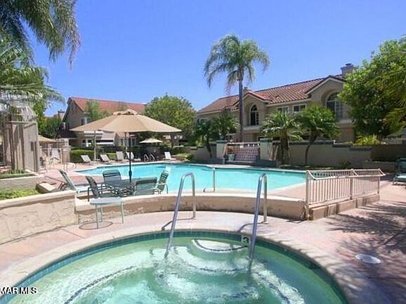 Located in beautiful Wood Ranch, this home features 3 bedrooms, 2 1/2 baths and approximately 1579 sf of living space. Gorgeous courtyard welcomes you in with garden & private entry. The family room features vaulted ceilings and tiled, gas fireplace. The eat-in kitchen has large windows to take in the courtyard view and boasts beautiful granite countertops, tile floors, dishwasher, new gas range, microwave and plenty of storage. Wood-like flooring is featured downstairs with Travertine tile on the stairs and upper hallway. All bedrooms are located upstairs, and secondary bedrooms are carpeted. This home has air-conditioning and each bedroom has its own ceiling fan. Large master bathroom with ensuite bathroom and walk-in closet. The rear patio is tiled and is a wonderful oasis for entertaining friends. The laundry area is located downstairs. 2 car, attached garage included. The desirable community of Village on the Green offers a pool/spa facility and great guest parking. Local golf course, restaurants, shopping centers and Wood Ranch trails are nearby. Easy commute to Moorpark, Thousand Oaks and Simi Valley and Cal Lutheran University.