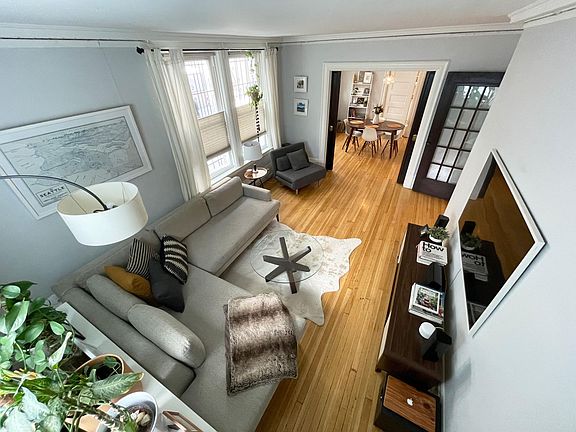 Spacious condoNewly remodeled kitchenHigh ceilingsOak hardwood floorsDining roomOriginal french doors
