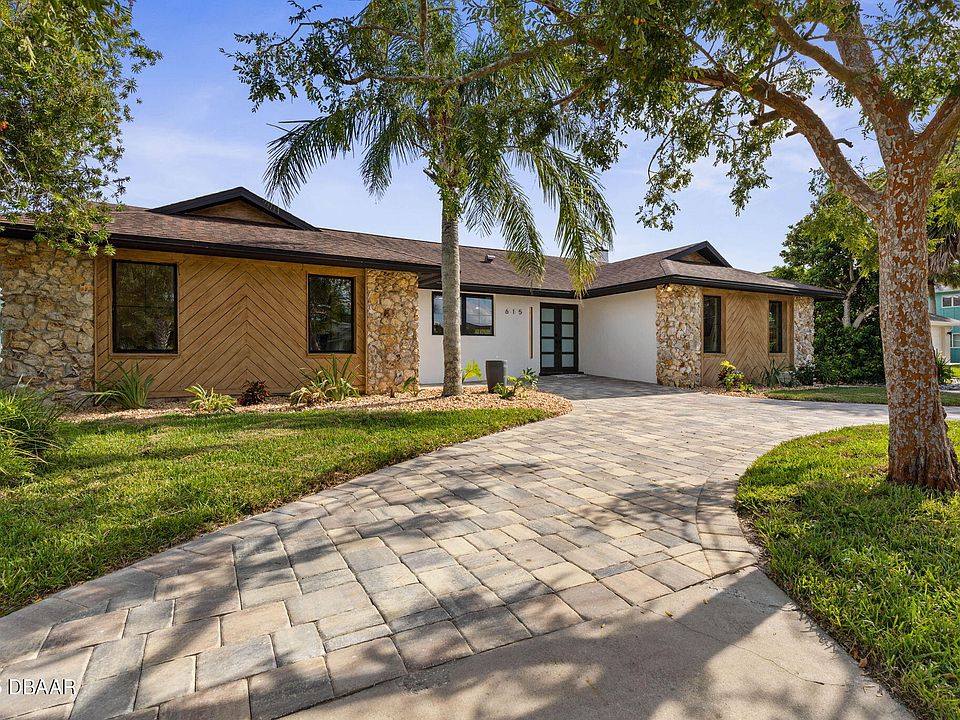 Your coastal lifestyle in Flagler Beach is here — just steps from the sand and only five homes from the Intracoastal. Spectacularly remodeled and exquisitely appointed, this waterfront residence on a saltwater canal offers a private dock, new pool, and brand new luxury finishes throughout. The chef's kitchen is a showpiece, featuring quartz counters, a built-in refrigerator, and a commercial gas range. The dining room includes a built-in wine bar with a double wine refrigerator — perfect for entertaining. An open great room with vaulted ceilings, stone fireplace, and dual sets of sliders seamlessly connect indoor and outdoor living. The thoughtful floor plan includes 4 bedrooms and 3.5 baths. The primary suite is a retreat with dual sinks, a walk-in shower with rain and handheld fixtures, and a large, custom walk-in closet with built-ins. One guest bedroom — large enough to serve as a second primary — enjoys a private ensuite bath, while the remaining two bedrooms share a Jack-and-Jill designed bath, ensuring every bedroom has direct bathroom access. A powder room is conveniently available for guests. Additional features include a separate laundry room with washer, dryer, built-in cabinetry, and folding area, plus an 650 sq. ft. oversized two-car rear accessed garage through with an 18' garage door and access to the backyard bar and entertainment space. Outdoor living is equally impressive. A large screened, pavered and covered lanai with a built-in summer kitchen and a playful surfboard-topped bar by the pool create an entertainer's paradise. The property showcases a low-maintenance paver and concrete driveway with an electronic privacy gate, while the backyard and driveway feature modern paver stone inlays surrounded by artificial turf for a clean, upscale finish. Energy-efficient geothermal heat pump systems provide heating and cooling, while new impact-resistant casement windows further enhance comfort and peace of mind. Beyond your dock, enjoy quick access to the Intracoastal Waterway for boating, inshore fishing, or ocean excursions. Just blocks away, Flagler Beach offers a laid-back, golf cart or walkable coastal lifestyle with its iconic pier, vibrant downtown restaurants and shops, and abundant opportunities for recreation on both land and water. This is a rare opportunity to own a fully remodeled, turnkey home that combines premium finishes, thoughtful design, private dockage, and a sought-after coastal location.