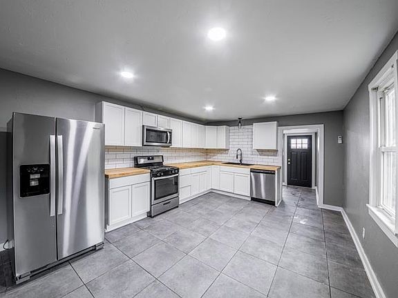 Butcher block counter topsGas stoveDouble sink vanityNew hot water tankFarm sink
