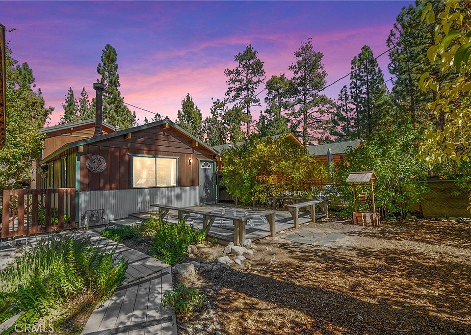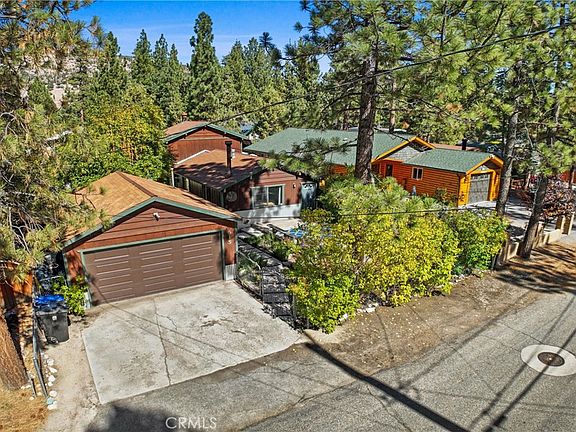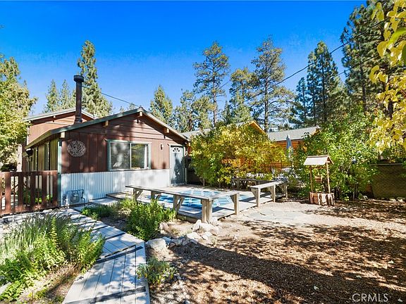 This charming and quaint mountain cabin offers 2 bedrooms, 1 bath, and approximately 1,064 sq ft of living space on a flat and spacious 5,000 sq ft lot with a detached 2-car garage. Surrounded by mature pine trees and natural beauty, the setting is serene and picturesque, perfect for those seeking a peaceful getaway, a second home, or a smart investment opportunity such as an Airbnb or short-term rental. As you enter the gated front yard, you’re greeted by custom walkways, lush greenery, and an expansive front porch with built-in benches—an inviting space to relax and take in the crisp mountain air. Inside, the cabin’s warm and rustic character shines through with wood-beamed ceilings, tongue-and-groove paneling, and two cozy wood-burning stoves—one in the dining area and another framed by a striking brick fireplace in the family room, creating inviting spaces to gather and unwind. The kitchen features raised-panel maple cabinets, easy-care countertops, and a custom tile backsplash that adds charm and color, seamlessly opening to the dining area for comfortable gatherings. Downstairs, you’ll find a cozy bedroom and a full bath with a light wood vanity, integrated sink, and designer tile tub-shower surround, blending rustic appeal with modern function. Upstairs, the vaulted wood-beam ceilings continue in the peaceful second bedroom, where large windows frame tranquil treetop views and a bold accent wall adds a touch of contemporary flair. Out back, the fully fenced yard offers the perfect outdoor retreat, complete with mature trees that provide shade and privacy, a sitting area ideal for entertaining, and plenty of open space for pets, kids, or gardening. The property features an herb garden with mint, oregano, sage, rosemary, and lavender, along with fruiting raspberry bushes and two apple trees, adding to the home’s mountain charm. A hammock invites lazy afternoons beneath the trees, while the spa pad provides a relaxing space to unwind under the stars. The detached garage offers ample storage, workshop potential, or even the opportunity to convert it into an ADU for added income or guest space. Located just minutes from Big Bear Lake, hiking trails, and local shops and dining, this home combines rustic character, comfort, and versatility—capturing the true essence of mountain living.