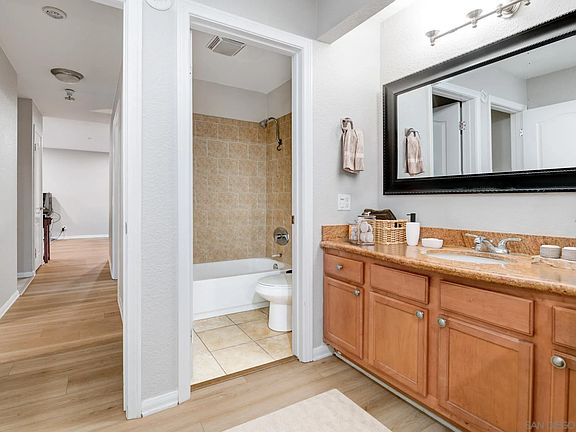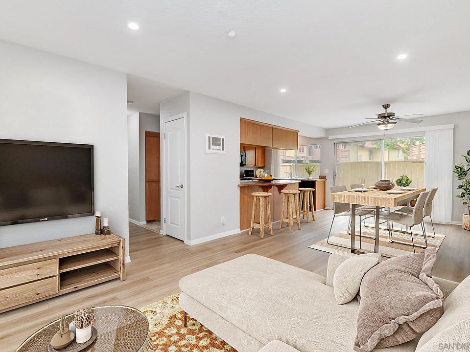 Light and bright turn-key Condo in Forest Glen! The unit boasts 2 parking spaces, is VA approved, pool and lush green landscaping, fully gated and close to all. Recent updates include wide-plank flooring, fresh paint, contemporary fixtures, and LED recessed lighting. The open-concept living/dining area adjoins the light and bright kitchen, boasting granite counters. A well designed split-bedroom layout provides privacy as well as room for guests, roommates, or a home office, with two full baths and ample closets. The community delivers resort-style amenities: sparkling pool, BBQ/picnic areas, greenbelts, and on-site laundry, plus an assigned covered carport for this unit. Pets welcome with restrictions. Enjoy an unbeatable Oceanside location: minutes to the San Luis Rey River Trail, Oceanside Harbor and beaches; easy access to Hwy-76, I-5, shopping, dining, and Camp Pendleton. HOA covers water & trash; move-in ready! Pet Friendly!