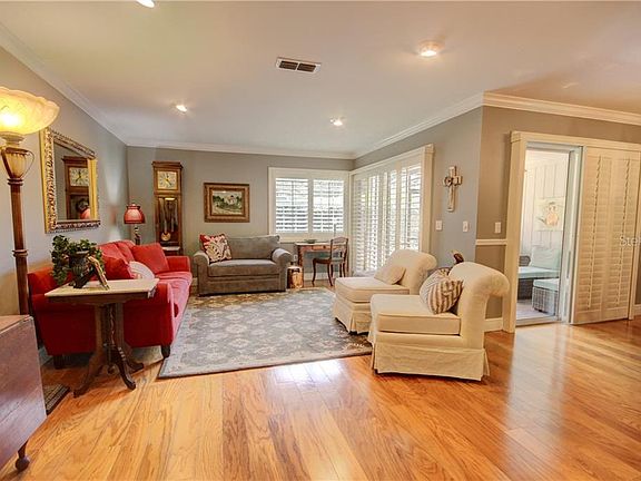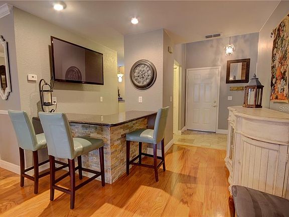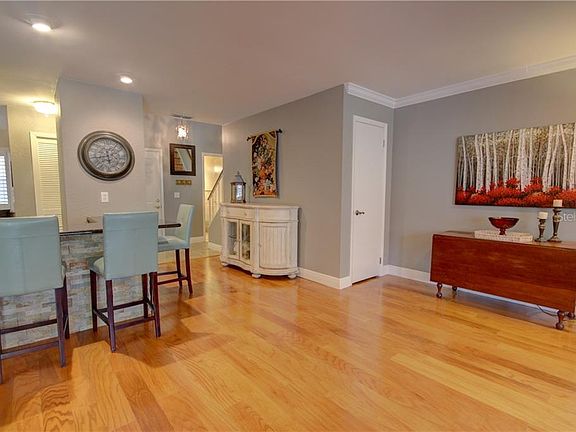 Your search is over! This beautifully updated 3 bedrooms 2.5 baths condo is located in the highly sought after Oak Harbour community. This home has been completely updated and is the definition of move-in-ready! The first thing you will notice as you enter the home is the beautiful hardwood flooring and 5 1/4" baseboards which run throughout the first floor living area. The living space is open and bright and great for entertaining. There is a custom built in bar with seating, Large living room with lots of light, spacious dining room and a large updated eat-in-kitchen. The kitchen features travertine flooring and backsplash, granite counters, stainless steel appliances and breakfast bar. Sliders off the living/dining rooms lead out to the homes private covered and screened lanai with no rear neighbors. All of the living areas including a half bath are located on the first floor with the master suite and two guest rooms up. The master suite is HUGE and features TWO walk-in-closets with custom organizers, updated bath with granite vanity, dual sinks, updated tile flooring and shower surround. Additional features include: Attached 1-car garage, Plantation shutters, Water filtration system, Fresh interior paint and updated fixtures throughout. Oak Harbour is a beautiful gated community that is packed full of great amenities. Residents can enjoy two community pools, tennis courts, a dock and boat ramp with access to Lake Orienta, Newly renovated fitness center and community club house. Call today!